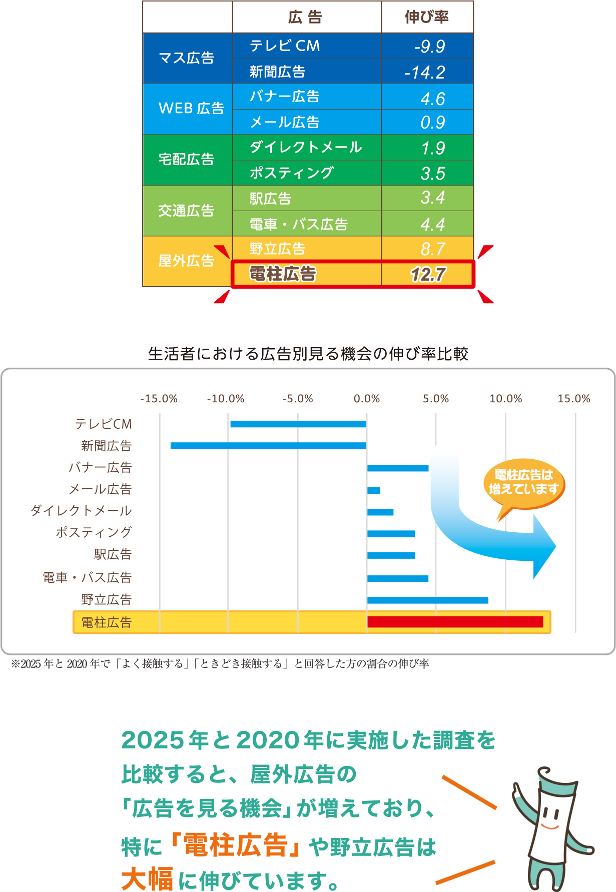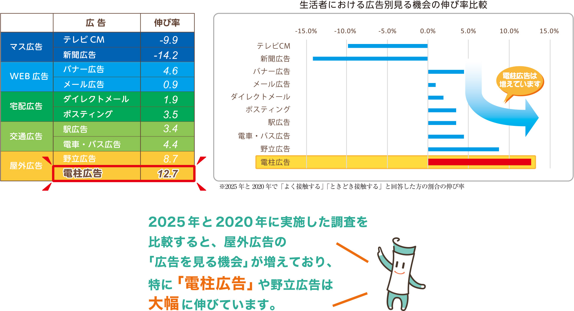 生活者の広告接触(2025年と2020年の差)で電柱広告や野立広告などのリアル系屋外広告が伸びている理由として、次の3点が考えられます。