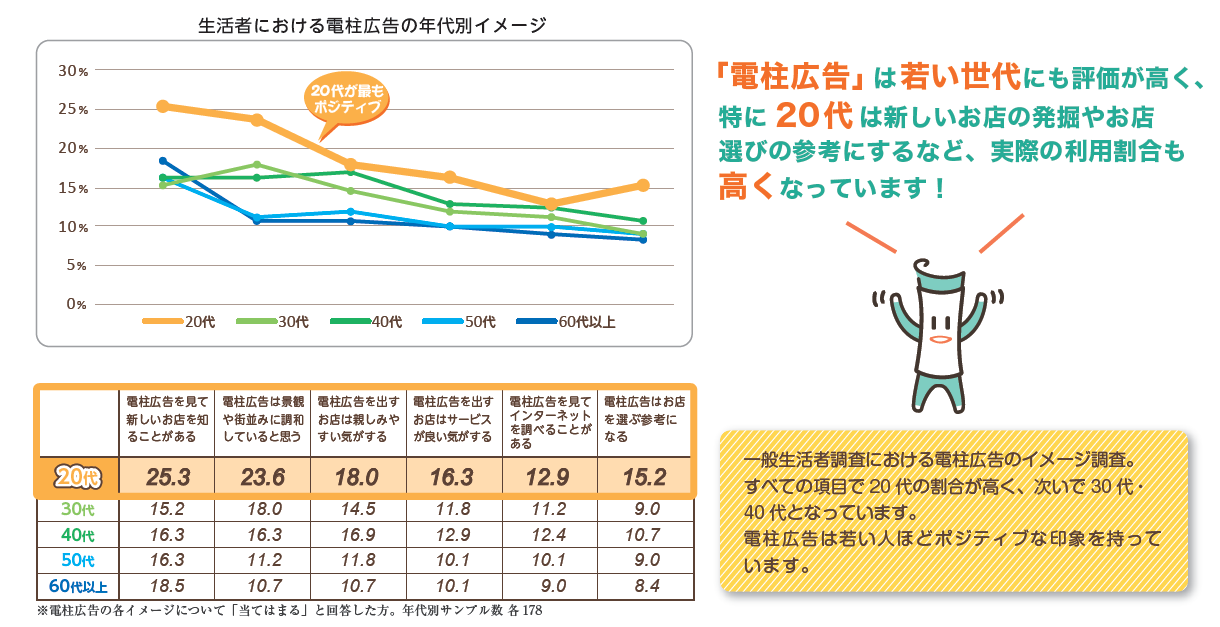- インターネット上では自分の考えや好みに合った情報が集まってくる仕組みがあります。デジタルネイティブな20代Z世代からすると、そうした仕組みがない電柱広告は意外な発見が多い広告として認識されているようです。